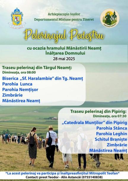 Arhiepiscopia Iașilor, prin Departamentul Misiune pentru Tineret, organizează în această zi „Pelerinajul Pedestru” cu ocazia hramului Mănăstirii Neamț – „Înălțarea Domnului”, la care va participa și Înaltpreasfințitul Părinte Mitropolit Teofan. Pelerinajul se va desfășura pe două trasee: unul din Târgu Neamț, cu plecare la ora 8.00, de la Biserica „Sfântul Haralambie”, cu opriri la Parohia Lunca, Parohia Nemțișor, Zimbrărie, până la Mănăstirea Neamț, și cel de-al doilea din Pipirig, cu plecare la ora 7.30, de la „Catedrala Munților”, cu opriri la Parohia Stânca, Parohia Leghin, Schitul Braniște, Zimbrărie, având aceeași destinație – Mănăstirea Neamț, unde vor participa la slujba de Priveghere.