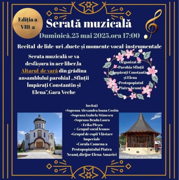 Parohia „Sfinții Împărați Constantin și Elena” – Gara Veche, Protopopiatul Piatra Neamț, organizează cea de-a VIII-a ediție a „Seratei Muzicale” care va avea loc începând cu ora 17.00, în aer liber, la „Altarul de vară” din grădina ansamblului parohial. La eveniment vor participa soprana Alexandra Ioana Costin, soprana Isabela Stănescu, soprana Laura Bradu, solista Erika Pleșca, grupul de copii „Vlăstare Imperiale”, grupul vocal „Iconos” și Corala „Camena” a Protopopiatului Piatra Neamț, dirijor Elena Amariei.